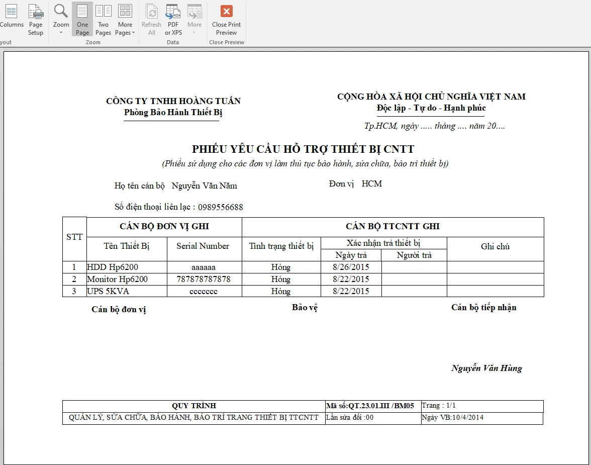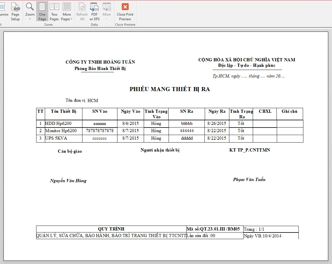 - Biểu mẫu và báo cáo mẫu trong chương trình