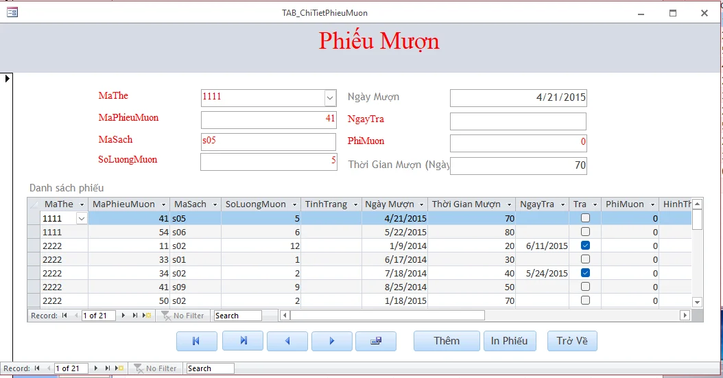 - In phiếu mượn, báo cáo tổng hợp theo ngày, tháng, hoặc năm bằng Report.